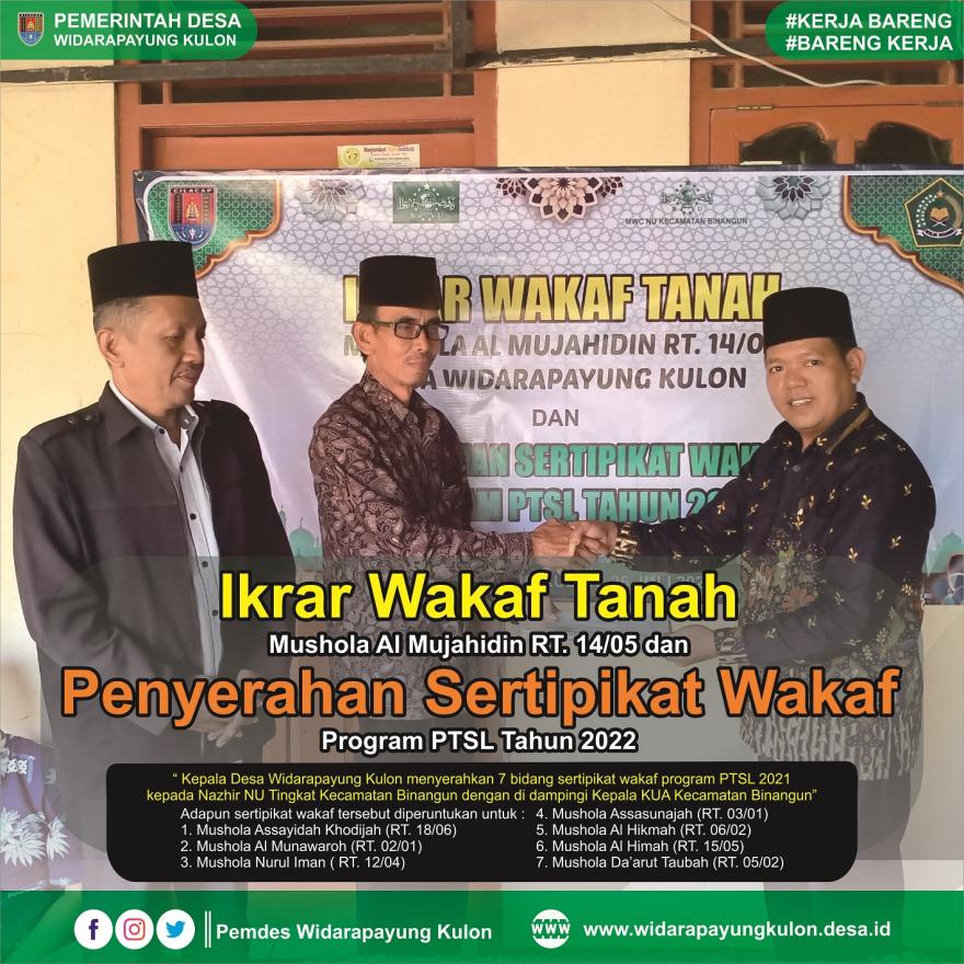 Pada hari ini Selasa tanggal dua puluh enam bulan juli tahun dua ribu dua puluh dua (26-07-2022) telah dilaksanakan Ikrar Tanah Wakaf peruntukan Mushola Al Mujahidin alamat Jalan Ciputat RT. 14 RW. 05 Desa Widarapayung Kulon dan Penyerahan Sertipikat Tanah Wakaf peruntukan Mushola di Desa Widarapayung Kulon dengan data sebagai berikut :