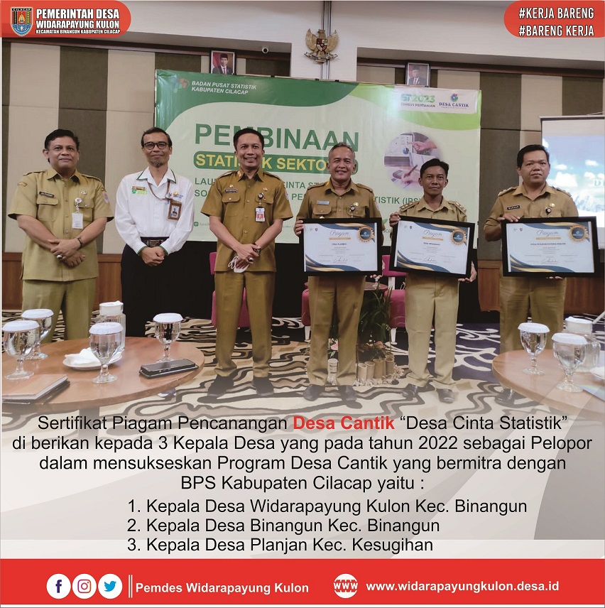 Pada Kesempatan ini dilaksanakan Penyerahan Sertifikat Piagam Pencanangan Desa Cantik oleh Bapak Awaludin Muri selaku Sekda Kabupaten Cilacap kepada Bapak Warsam Kepala Desa Widarapayung Kulon.